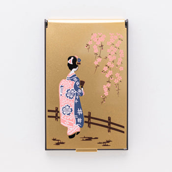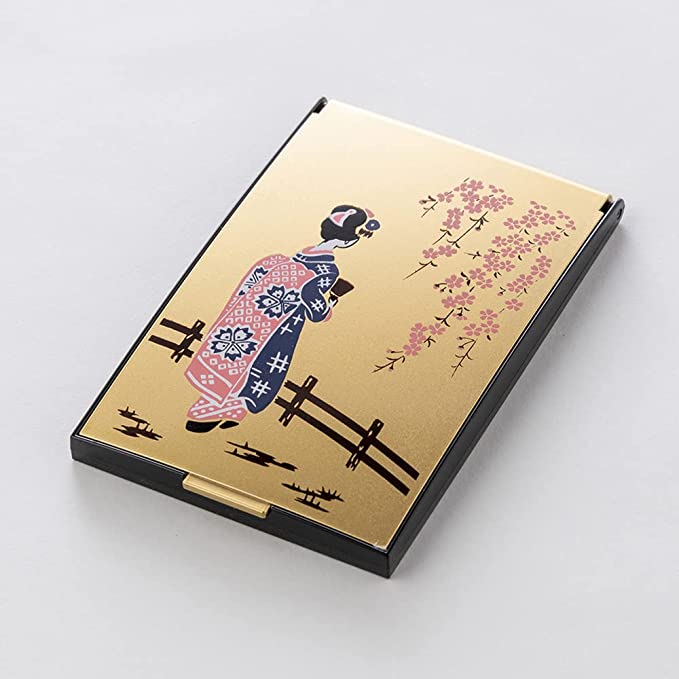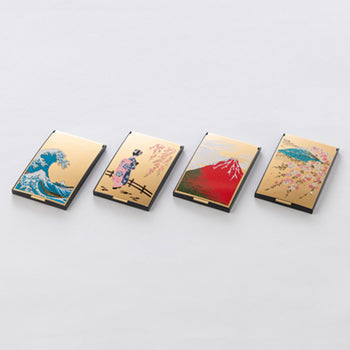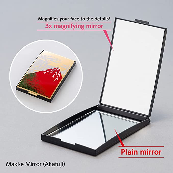 Maki-e Mirror A mirror decorated with maki-e, a traditional Japanese craft Maki-e is a typical technique of lacquer ware developed uniquely in Japan and has been used for about 1,200 years. The surface of a vessel is painted with lacquer using a fine brush, and gold powder is sprinkled on top of the lacquer before it hardens to reveal a pattern. The name "maki-e" comes from the meaning of "to sprinkle and make a picture. Maki-e has been exported to Europe and other countries for 400 years and is still known as "maki-e" in foreign countries. This compact mirror set includes a mirror with maki-e and a magnifying mirror with 3x magnification. The 3X magnifying mirror is a model with a 600r curvature. The 3X magnifying mirror is a model with a curvature of 600 r. It is ideal for skin care such as skin exfoliation, blemishes, wrinkles, and so on. This product is a fusion of traditional Japanese craftsmanship and a makeup mirror.