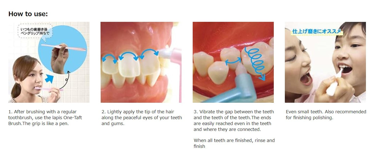 The Lapis One-Tuft Brush is also perfect for follow-up brushing with children. The pointed tip of the compact head is perfect for precise use such as with newly formed teeth or in areas where teeth do not align perfectly and overlap.