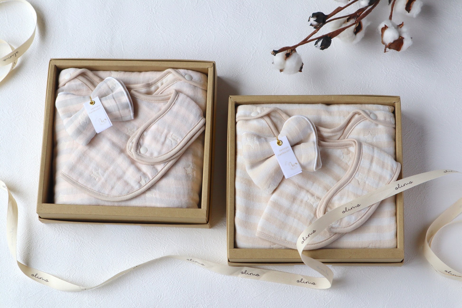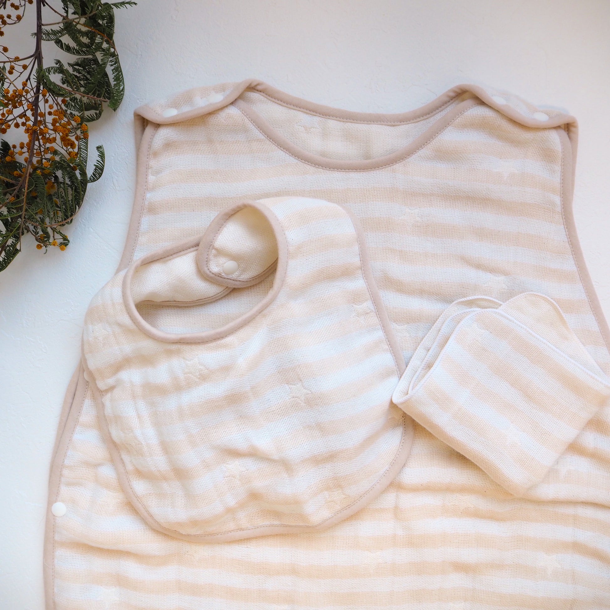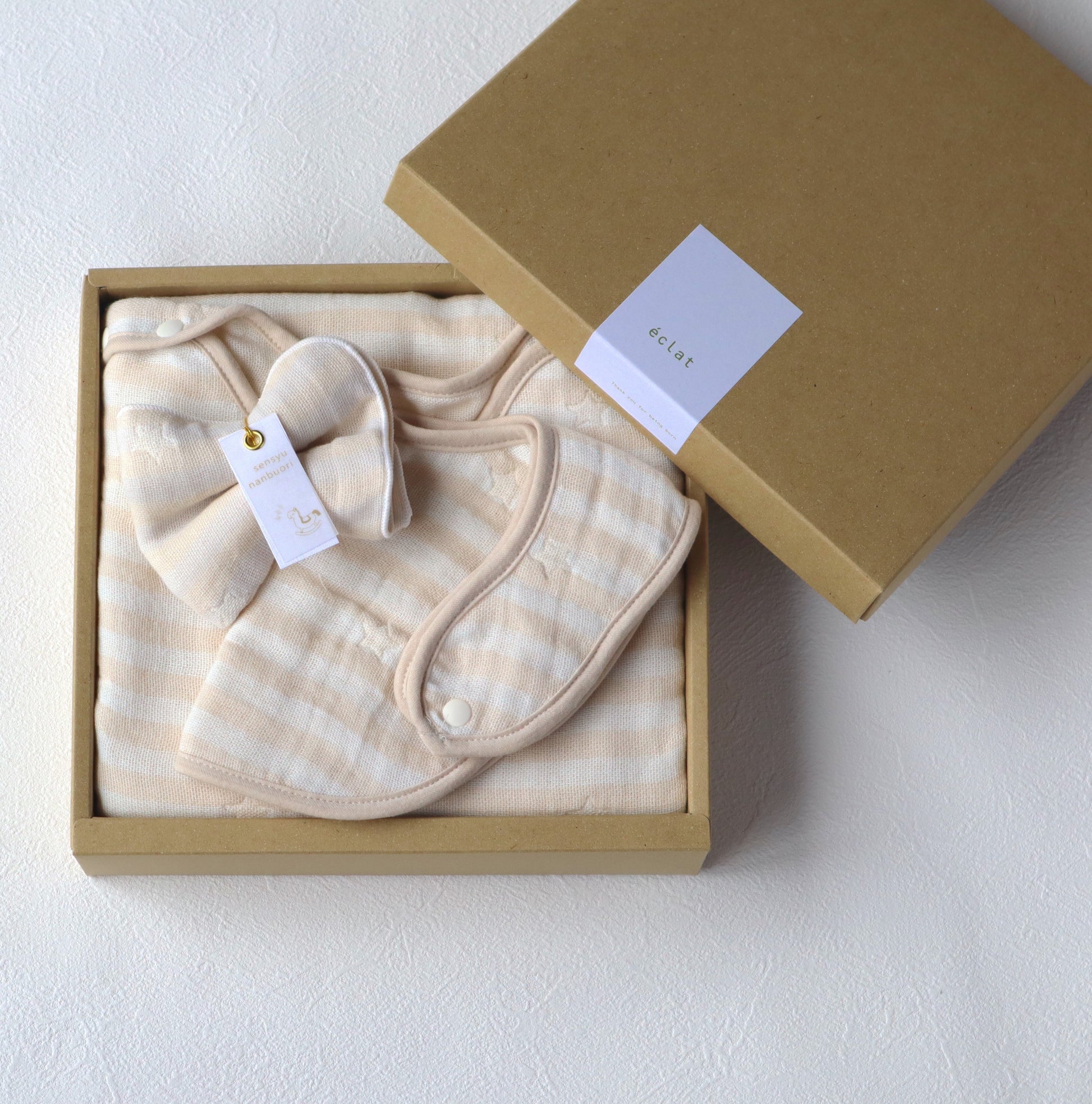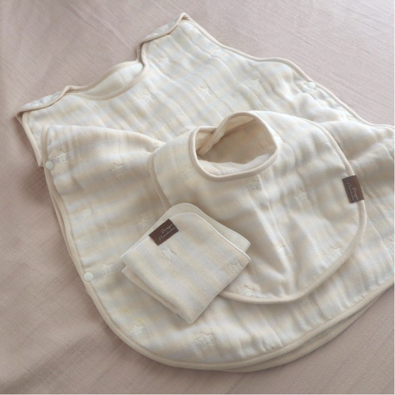 This is an original gift box that includes a sleeper, a bib, and a handkerchief made of four-layered gauze fabric. The natural striped star pattern, expressed by weaving rather than printing, is a cute design for both boys and girls. The gauze fabric is made of 100% cotton and woven softly and fluffy for babies with delicate skin. The gauze fabric is highly absorbent and gently wraps the baby's sweaty skin. This gift box is perfect for baby shower preparations or as a baby shower gift.